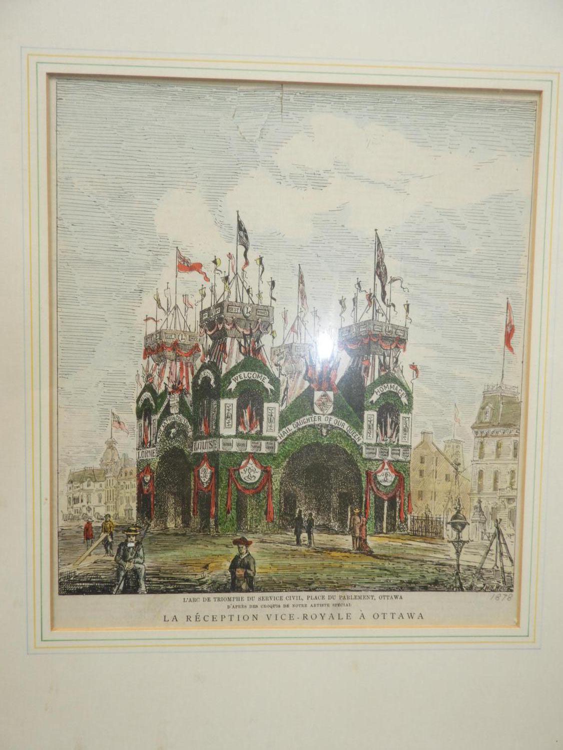 john william hurrell watts, coloured print, 10" x 9", "l'arc de triomphe du service civil, place du parlement, ottawa".