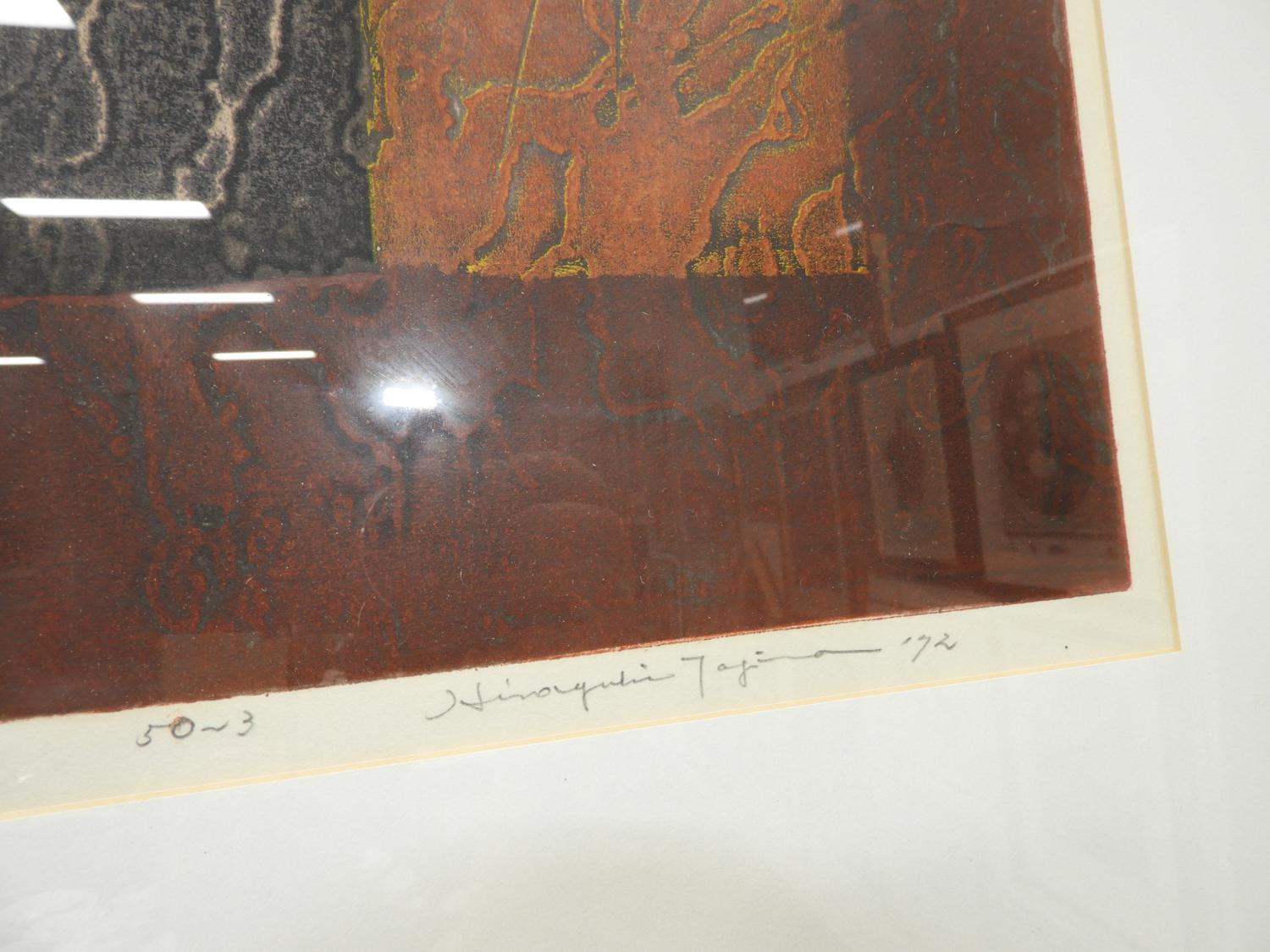 hiroyaki tajima, d.1973, woodcut in colours, 23" x 17", "castle-gate".