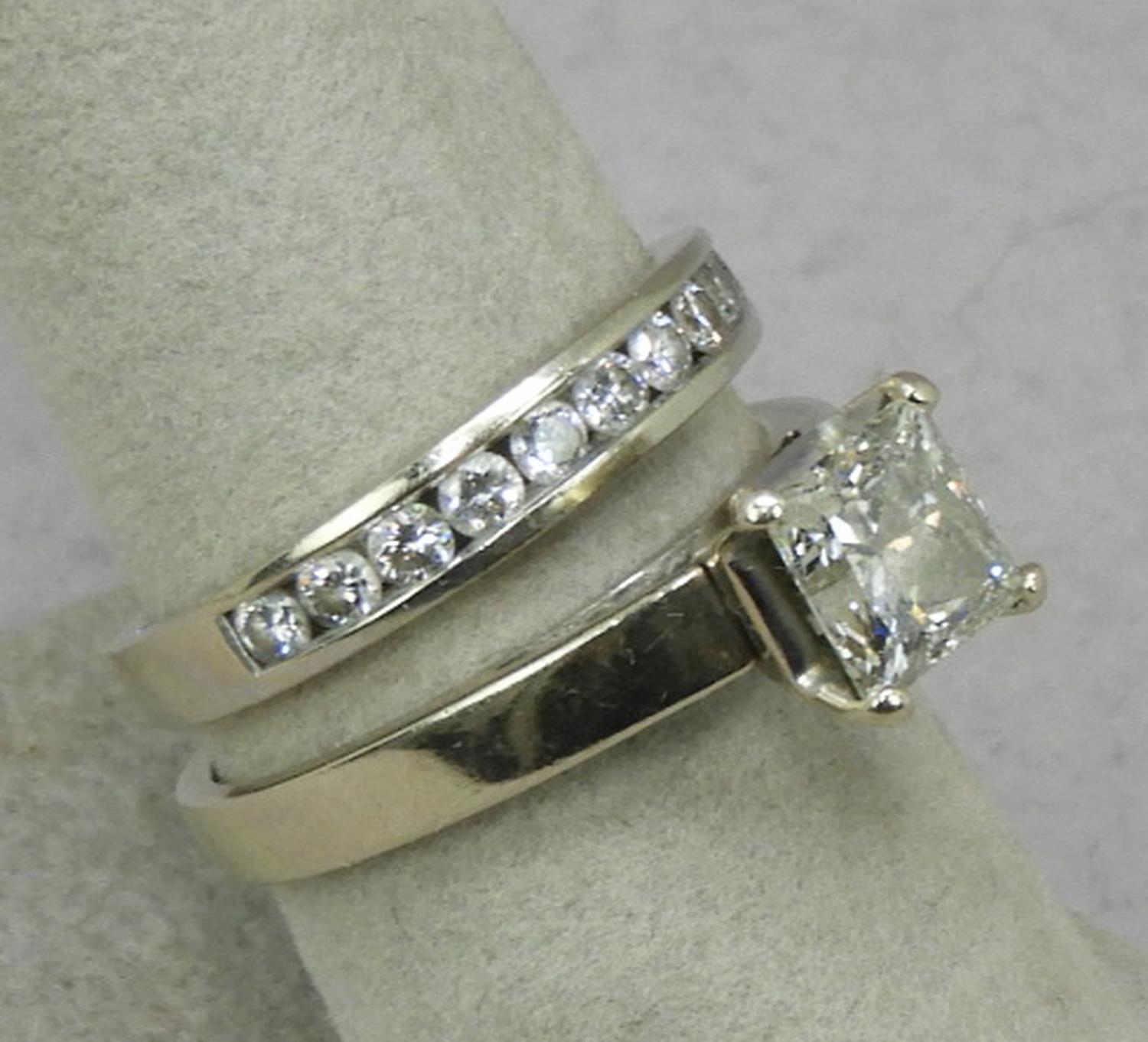 ladies 14k white gold princess cut diamond engagement ring with band, 1.57 cts, 1-2, j, very good with gemscan diamond cert