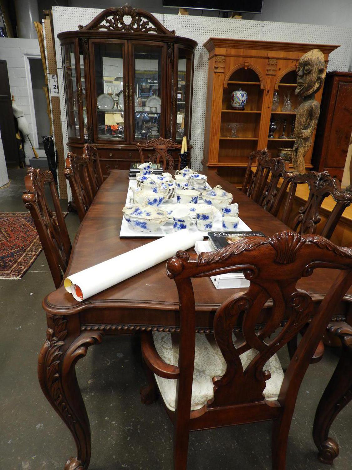 ten piece mahogany finish dining suite including cabinet, 8 chairs, extending table